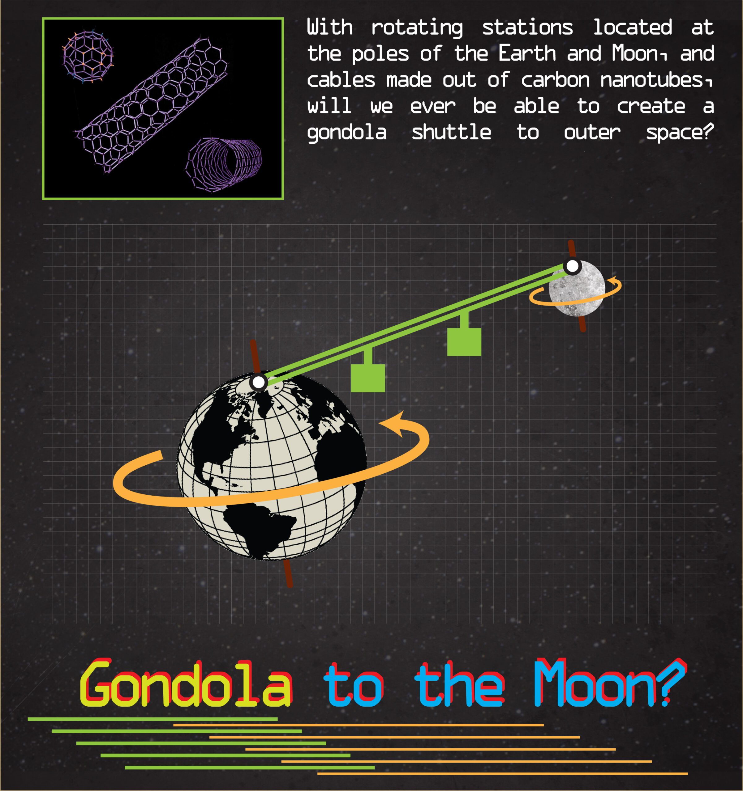 This week on the Gondola Project forum, in response to last week’s post about the future of aerial transit, there was a video response with the Jetson’s theme song displaying the idea of personalized flying mobiles. This got me thinking about both science fiction and outer space (since everything in that show appears to be hoovering in the air). Logically this brought me to contemplating a space gondola with rotating stations and carbon nanotube cables (how else?!).